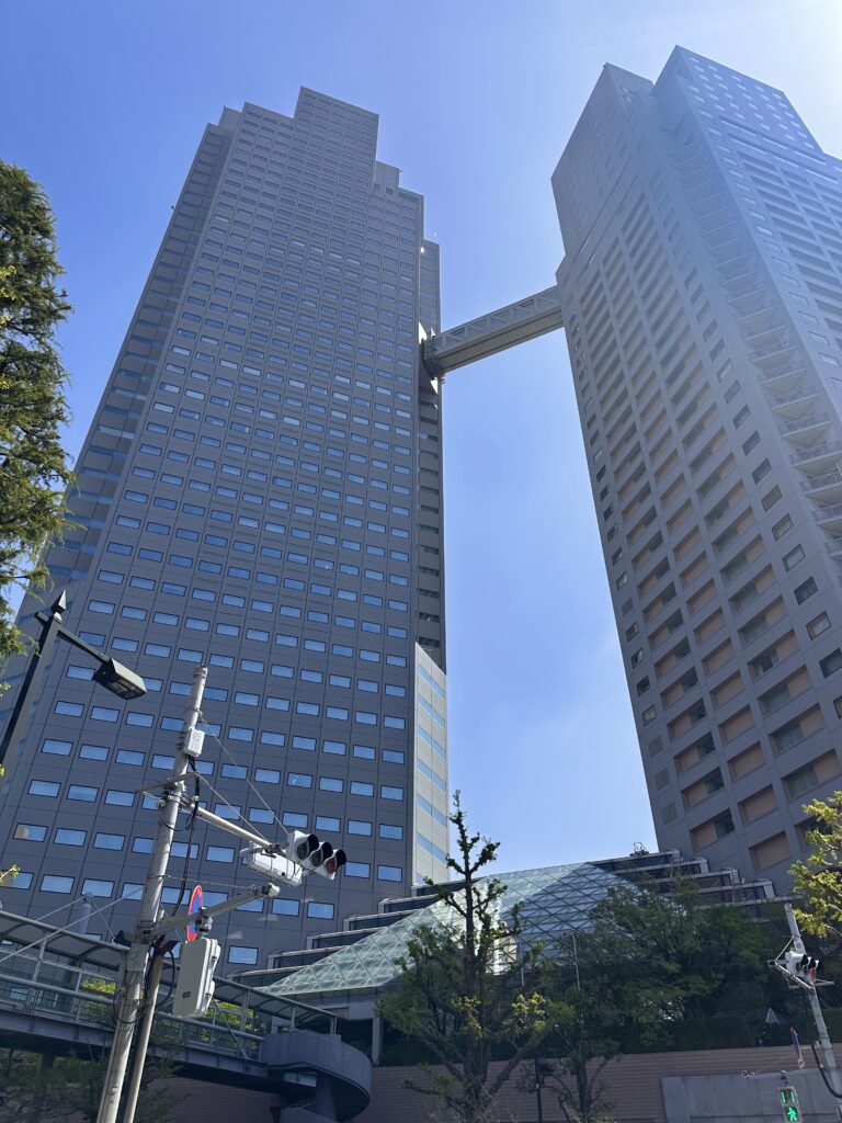 背の高い建物に向かっておる